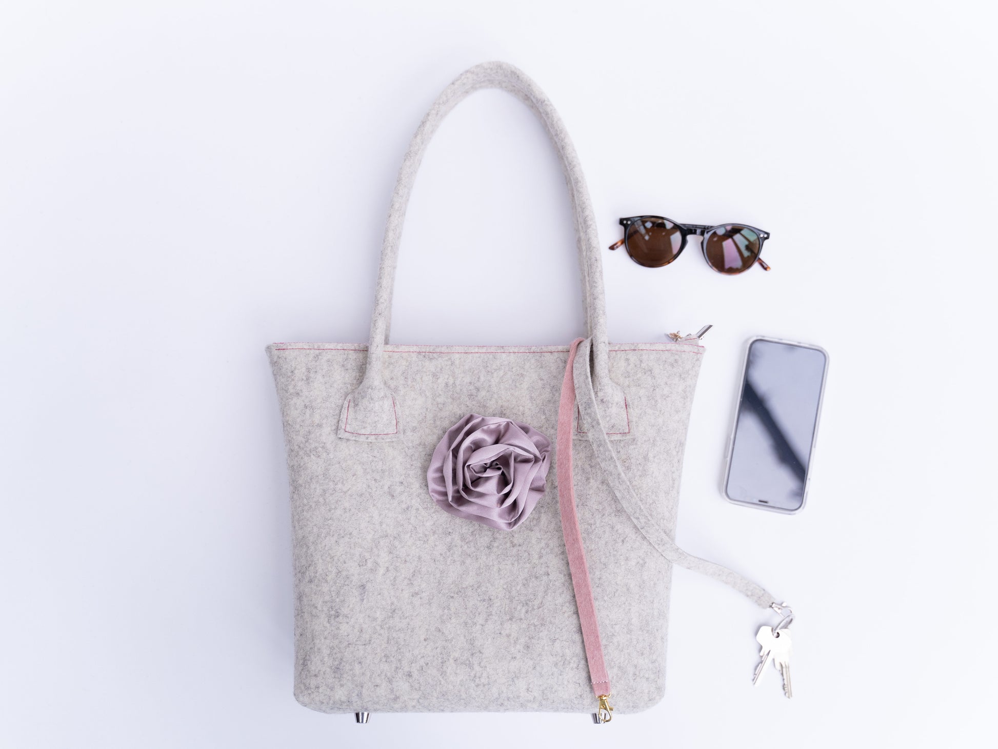 Unsere FINE FELT *G* Shoulder-Bag in Tulpenform, hellgrau-melange, ist der ideale Begleiter für den Alltag.